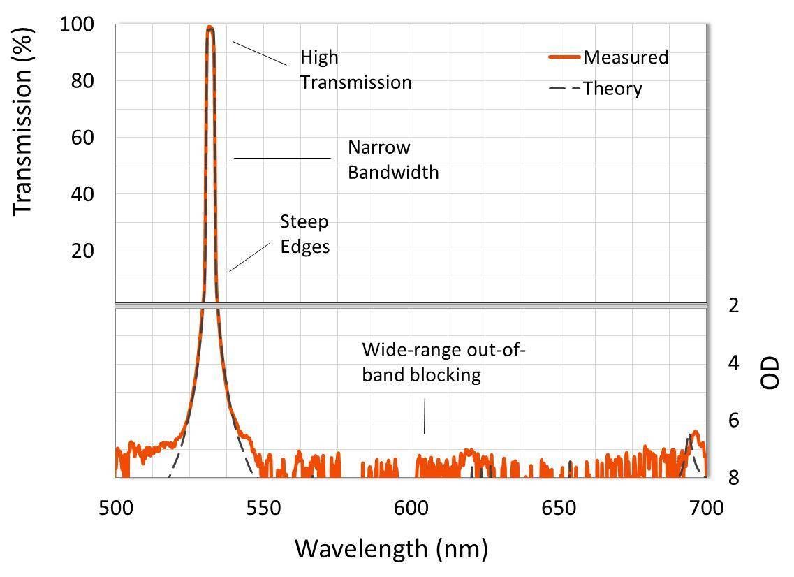 De plus, en raison de la précision des signaux de retour LIDAR, les filtres sont pour la plupart interférentiels à couche mince à bande ultra-étroite. Ces filtres doivent être capables de fournir une transmission élevée sur une bande passante ultra-étroite afin d'isoler le signal de retour, et permettre aussi un blocage hors bande sur une large gamme de longueurs d'onde pour atténuer la lumière du soleil et d'autres lumières étrangères. Cependant, il existe de nombreux types différents de systèmes LIDAR qui exigent chacun nécessairement des exigences de filtres spécifiques à l'application afin de maximiser les rapports signal sur bruit. Les altimètres laser, par exemple, nécessitent généralement que les filtres d'interférence à bande ultra-étroite (Ultra NL ) aient une largeur à mi-hauteur (FHWM) inférieure à 1,5 nm, tout en réalisant une transmission de plus de 90% à la longueur d'onde laser et supérieure à OD6 (-60 dB ou 0,0001% de transmission), avec un blocage hors bande de ~ 300 à 1300 nm. Les filtres Raman LIDAR, en revanche, doivent avoir des profils de transmission ultra-steep (raides) pour que le signal Raman soit transmis au détecteur pendant que les signaux de rétrodiffusion élastiques les plus forts de la longueur d'onde laser sont bloqués à un niveau de OD8 (-80 dB ou 0,000001% de transmission).