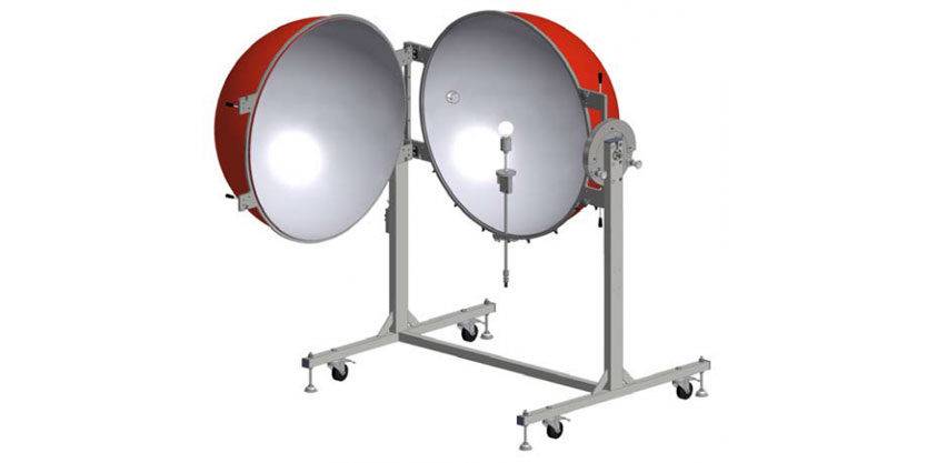 Sphère d’intégration avec revêtement de sulfate de baryum. 1000 mm de diamètre interne. Support d’échantillons UMSH-AP-1000 réglable en hauteur. Déflecteur entre le détecteur et le centre de la sphère pour les lampes d’une longueur maximale de 300 mm. Lampe auxiliaire halogène 12V / 100W. Support de table.